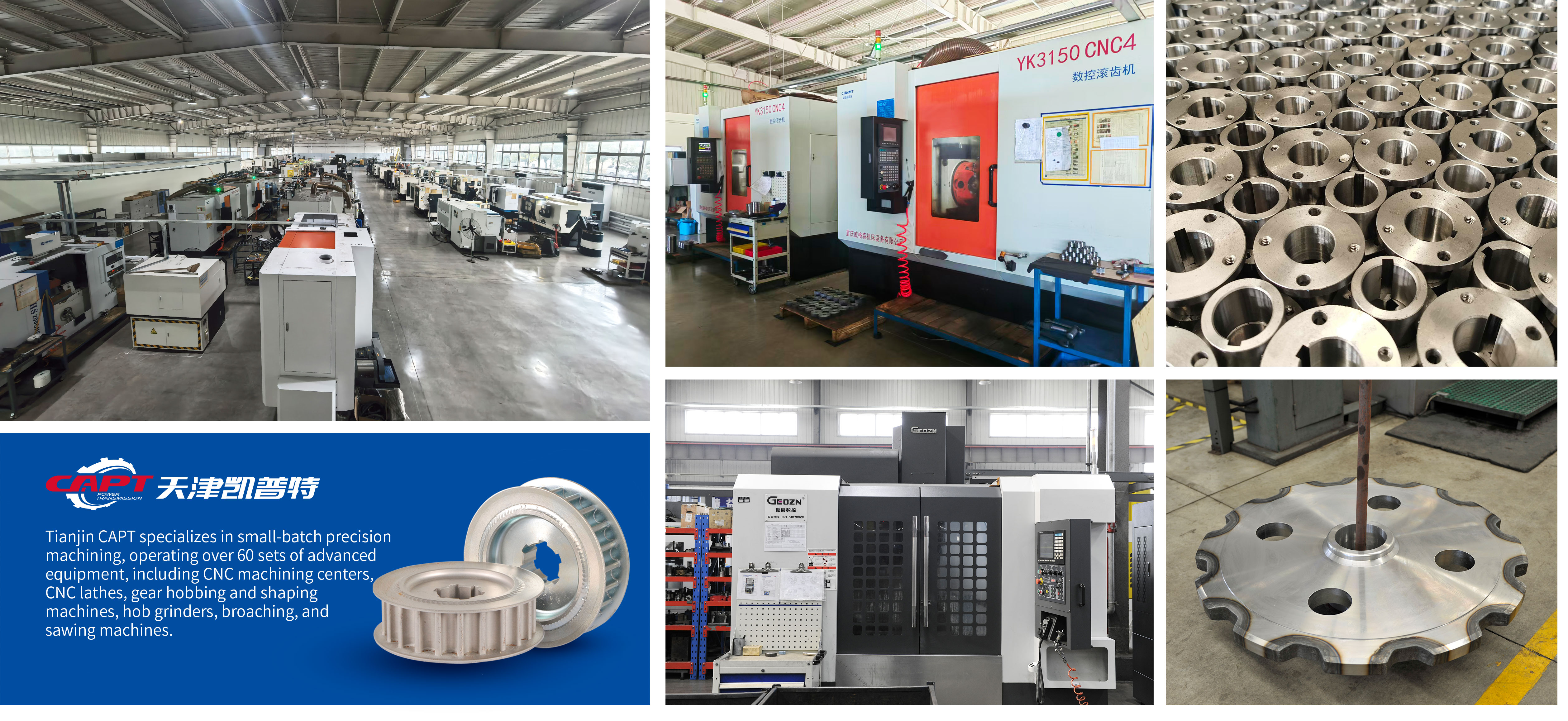 Established in December 1993 in Tianjin's Binhai New Area, Tianjin CAPT Power Transmission Machinery Co., Ltd. prioritizes customer value creation. Leveraging years of technological prowess and factory management, it focuses on the production and sales of mechanical power transmission parts'. With a team of over 20 experienced technicians and four design engineers, Tianjin CAPT specializes in small batch machining, with nearly 100 precision equipment units, including but not limited to CNC machine centers, lathe, gear hobs, broaches, grinders, sawing machines, etc.