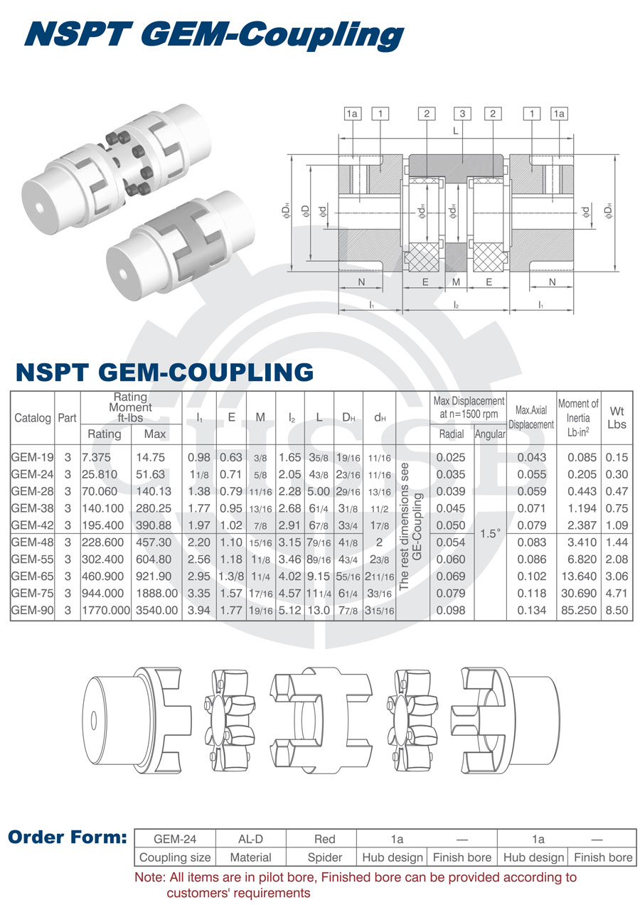 產品范圍: 美標/歐標:(GEM) 英制尺寸產品(適用于美標市場) 公制尺寸產品(適用于歐標市場) GEM型聯軸器