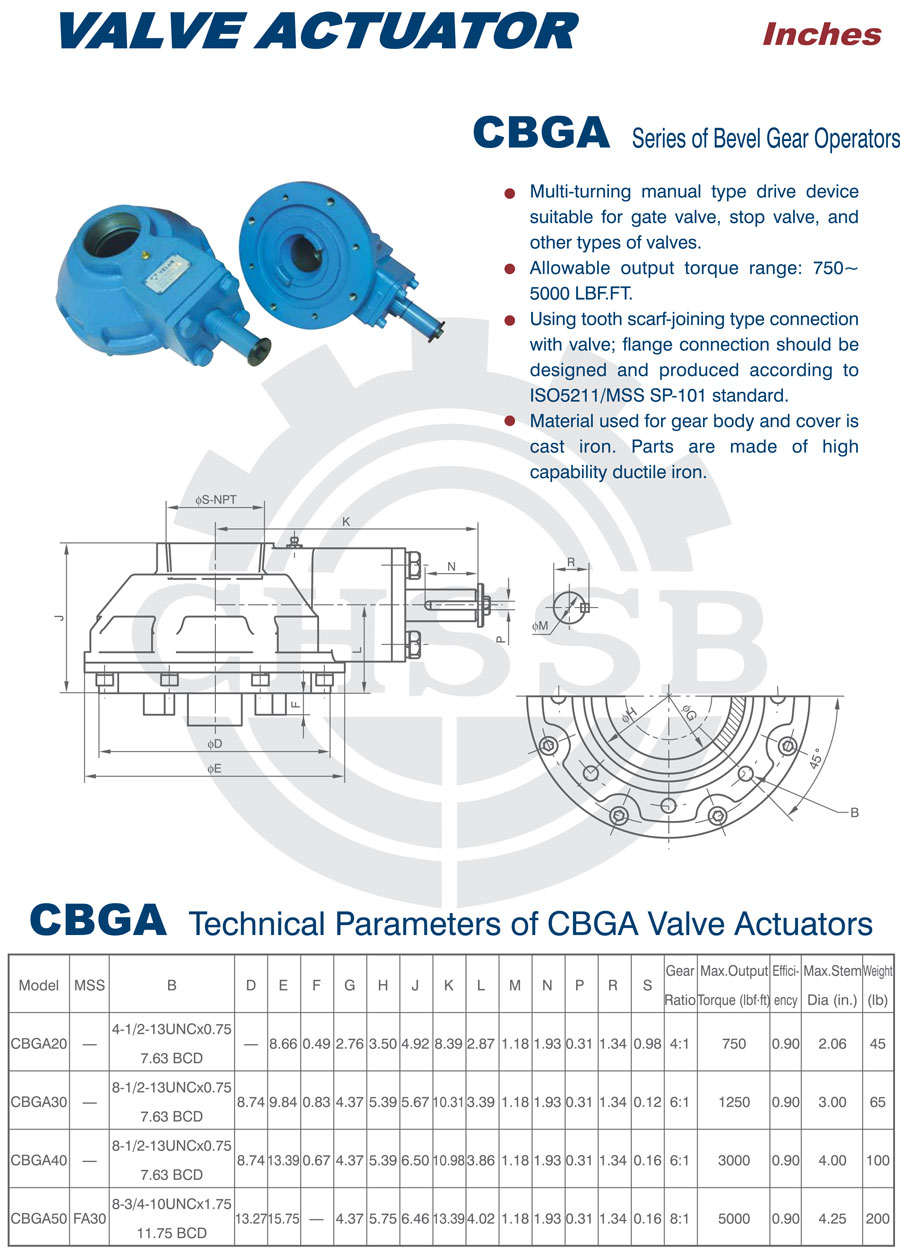 CBG(V)系列錐齒輪驅動器:該產品是一種全回轉型驅動裝置,適用于閘閥、截至閥等閥板做直線運動的閥門。