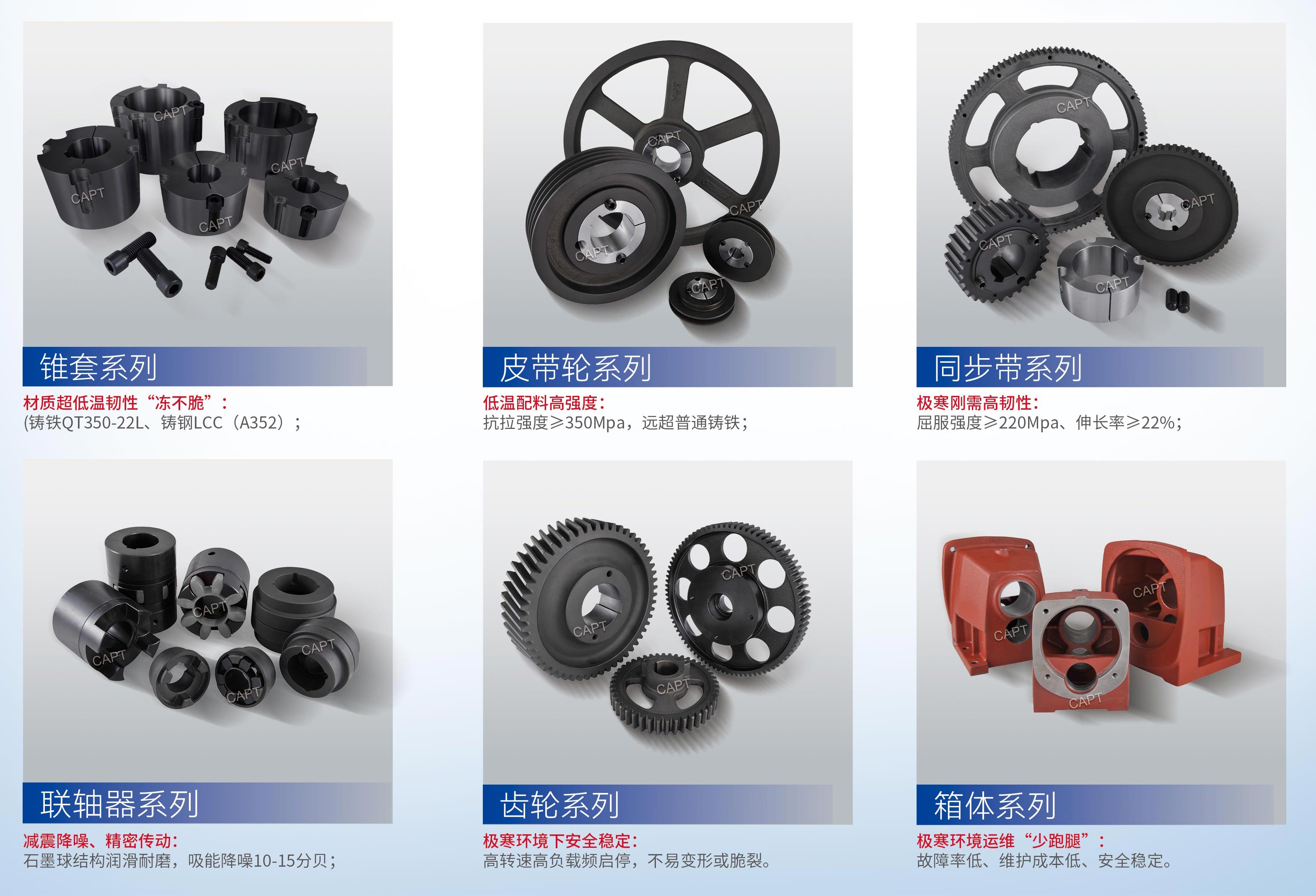在高緯度冰封荒原、高海拔雪域等極端環(huán)境中,-30℃甚至 - 40℃的低溫如同 “隱形殺手”—— 普通機(jī)械傳動(dòng)零件易因低溫脆性斷裂、尺寸變形、頻繁故障陷入癱瘓,不僅影響設(shè)備運(yùn)行,更推高運(yùn)維成本。而超低溫球墨鑄鐵或者鑄鋼傳動(dòng)件(涵蓋皮帶輪、同步帶輪、鏈輪、齒輪、聯(lián)軸器、聯(lián)接錐套、箱體等全品類(lèi)),正是為破解極寒挑戰(zhàn)而生的可靠之選。